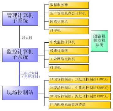此污水處理廠工程的監(jiān)控系統(tǒng)由PLC、計算機控制管理系統(tǒng)組成的上端系統(tǒng)和儀表檢測系統(tǒng)兩部分組成,其中上端系統(tǒng)中的管理計算機子系統(tǒng)由數(shù)據(jù)服務(wù)器、生產(chǎn)管理及辦公計算機、網(wǎng)絡(luò)交換機、打印機等組成;監(jiān)控計算機子系統(tǒng)由兩臺中央監(jiān)控計算機、投影儀系統(tǒng)、打印機、工業(yè)網(wǎng)絡(luò)交換機組成。